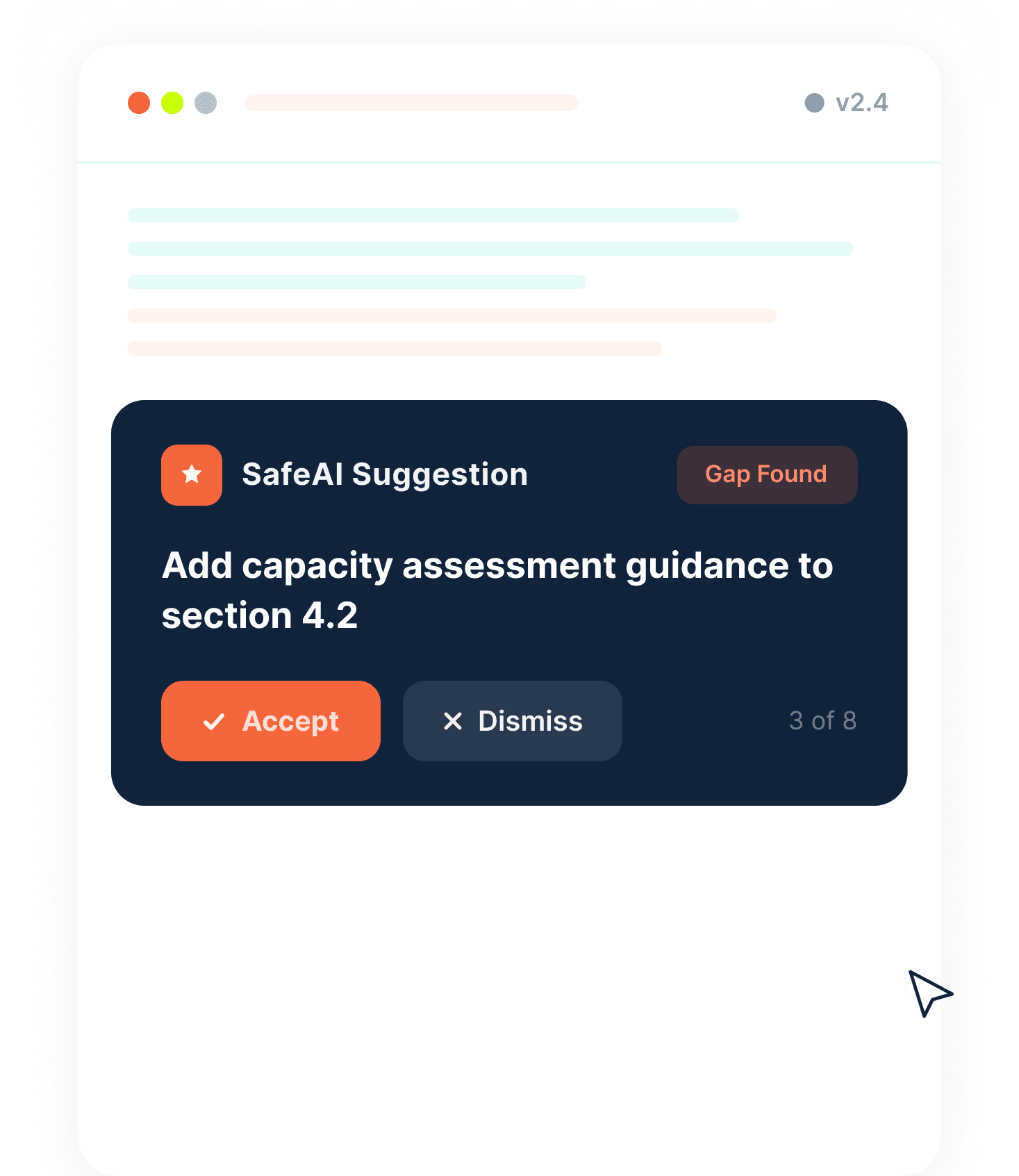 Our AI monitors regulatory changes 24/7 and flags exactly what needs updating in your policies. Review AI- powered suggestions, accept changes with one click, and let the system handle versioning, scheduling, and staff acknowledgement.