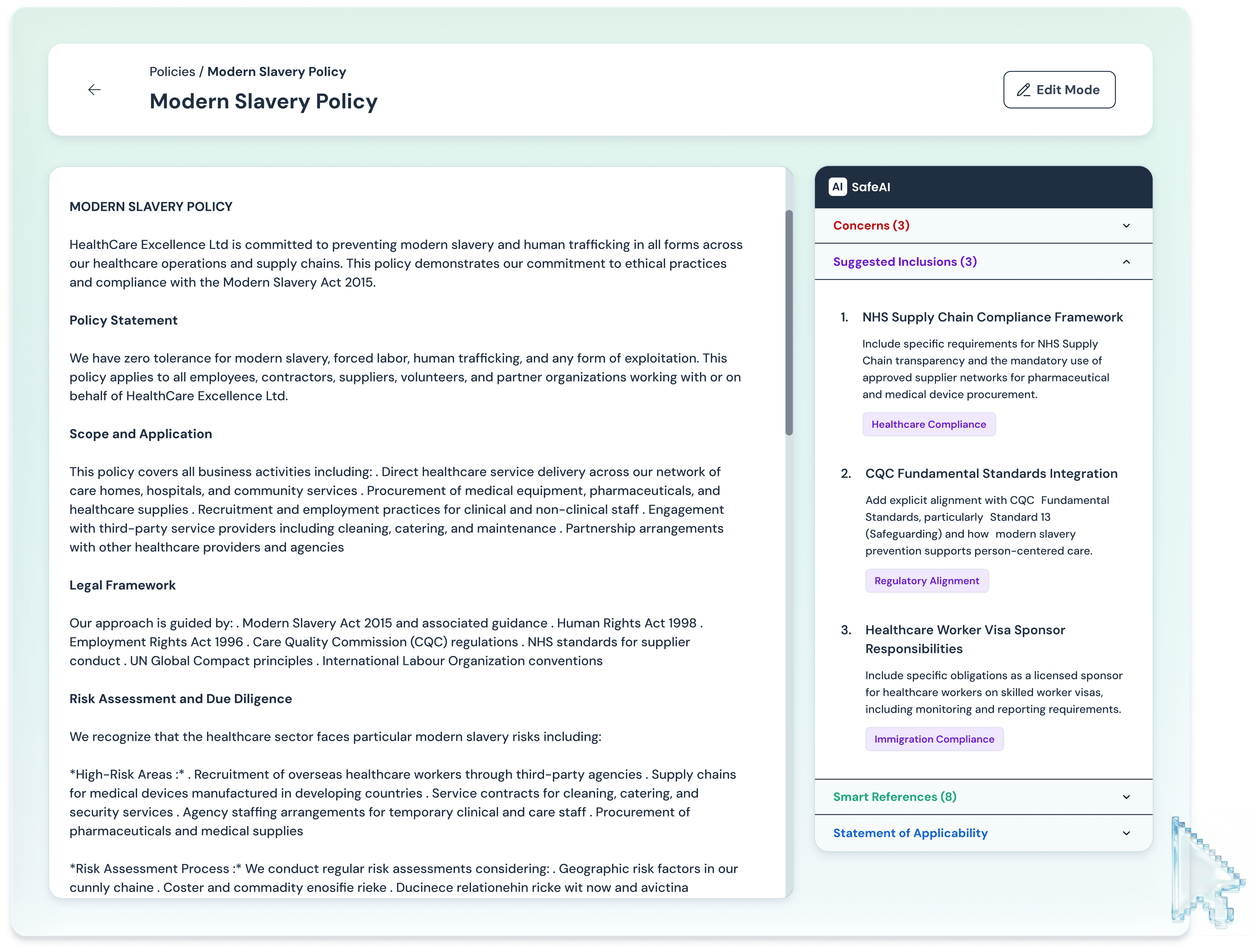 Our AI monitors regulatory changes 24/7 and flags exactly what needs updating in your policies. Review smart suggestions, accept changes with one click, and let the system handle versioning, scheduling, and staff acknowledgements.