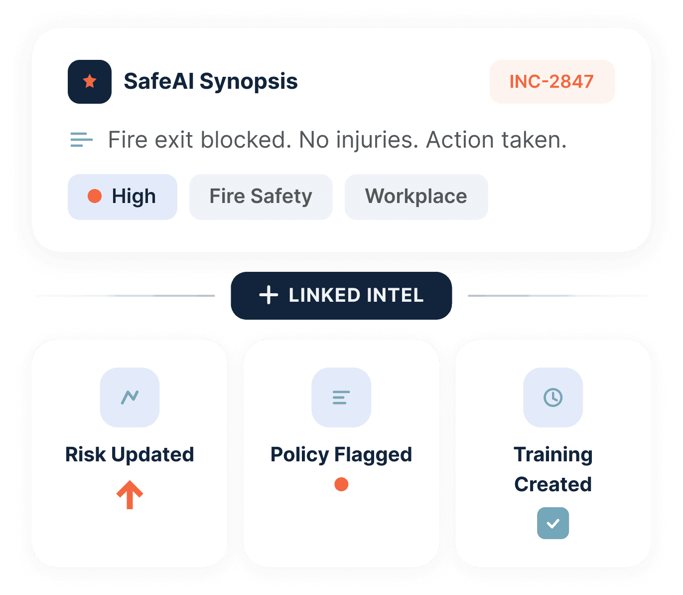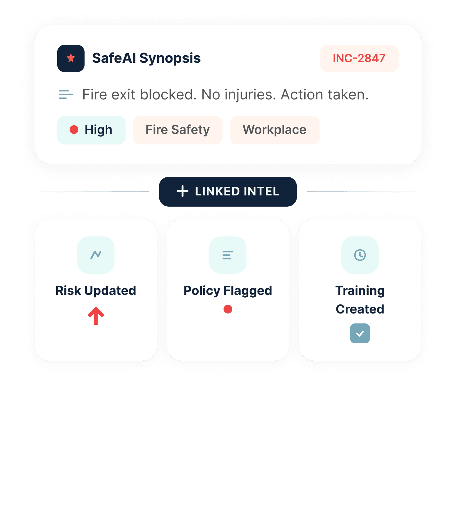 When an incident occurs, Linked Intel automatically surfaces connected risks, flags affected policies, triggers relevant training, and updates audit evidence. Cross-module intelligence means nothing falls through the cracks.