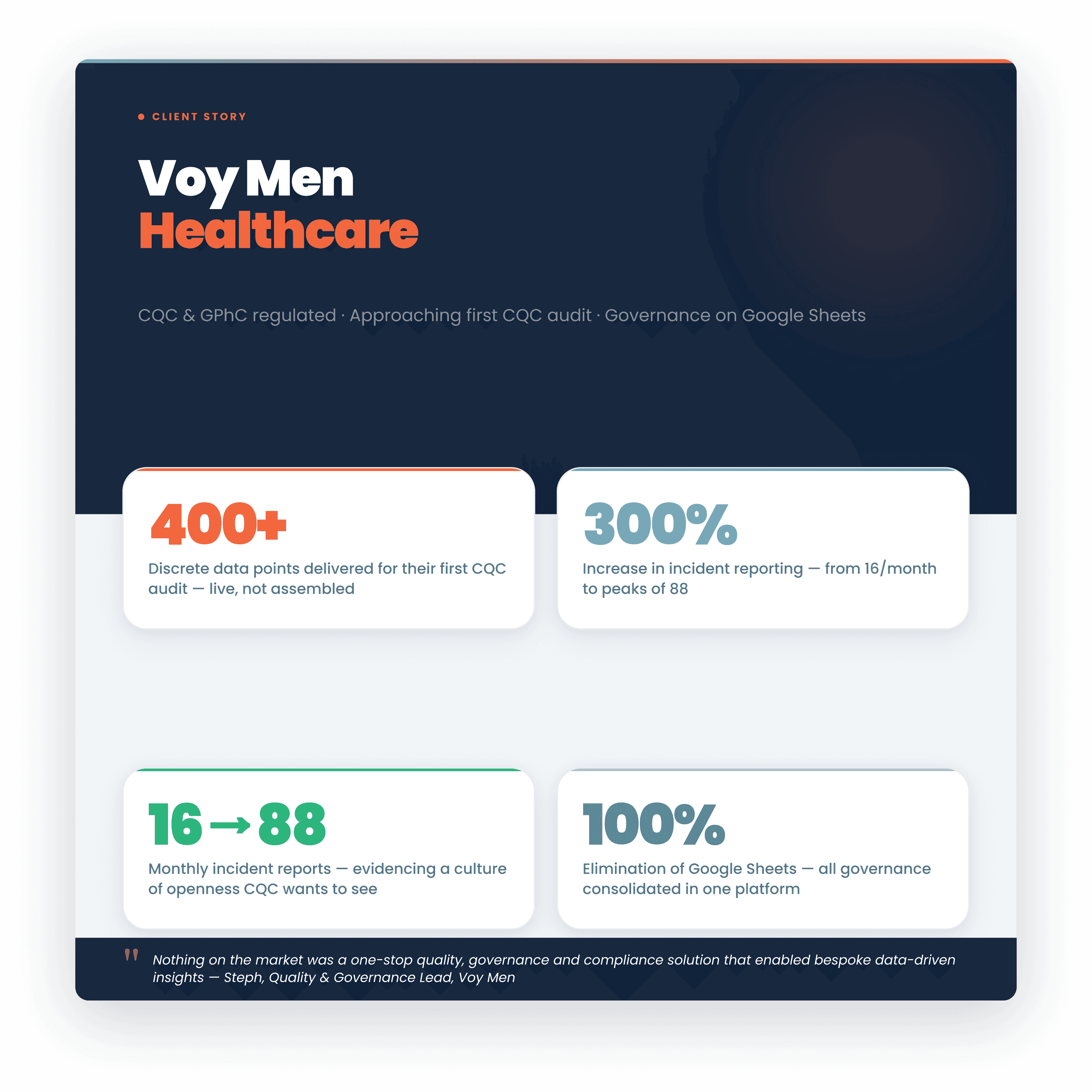 By the time their CQC audit arrived, Voy Men's team had produced over 400 discrete data points covering incident trends, root cause analysis, action completion rates, risk register status, policy compliance, and evidence of learning. None of it was assembled the night before. It was live, structured, and audit-ready at all times. The evidence was there when the inspector arrived because the system had been building it continuously since day one.