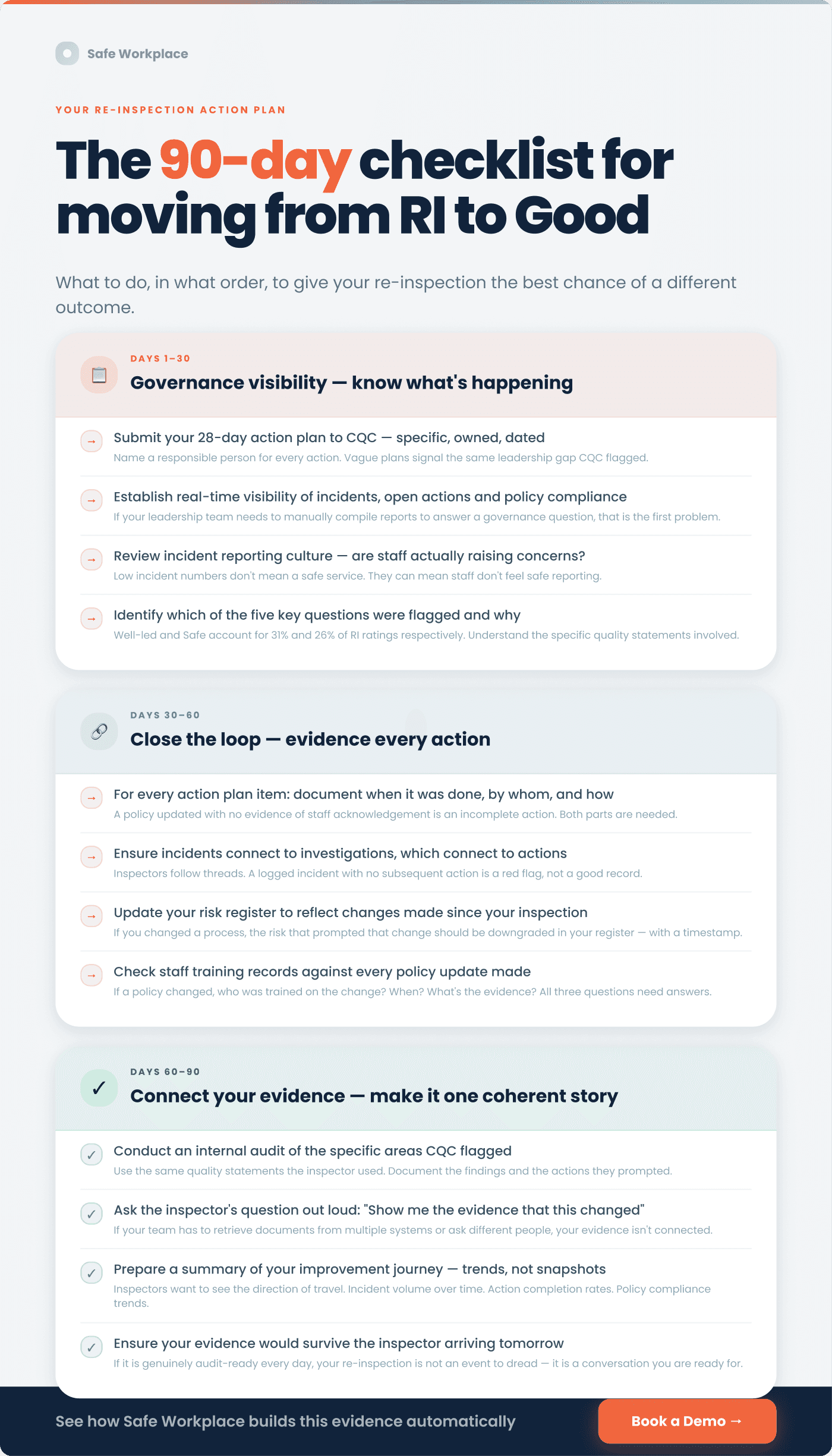 The most common gap at re-inspection is not the absence of improvement but the absence of connection. Your incidents should connect to your risk register. Your audits should connect to your action plans. Your policy updates should connect to your training records. Your training completion should connect back to the original concern that prompted the training. Inspectors are looking for a system, not a collection of separate processes. If your evidence cannot be navigated as a coherent whole, use the next 30 days to build those connections deliberately.