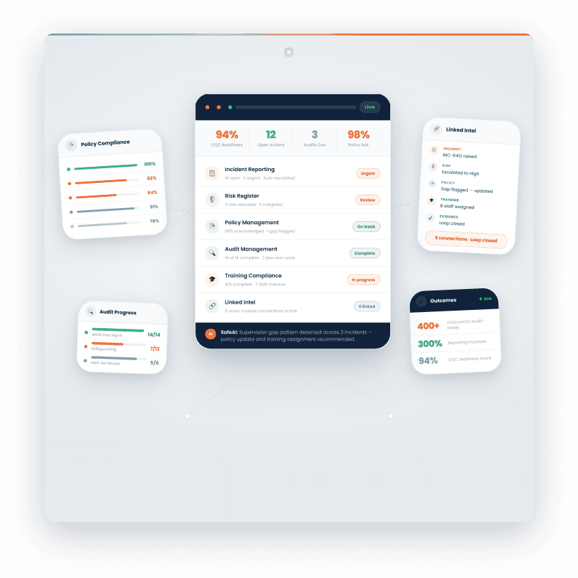 Your leadership team needs real-time visibility of what is happening across the service. If your current systems require someone to manually compile information from multiple sources to answer a question about incident volumes, open actions, or policy compliance, that is the first thing to address. You cannot improve what you cannot see, and CQC cannot assess improvement that they cannot evidence.