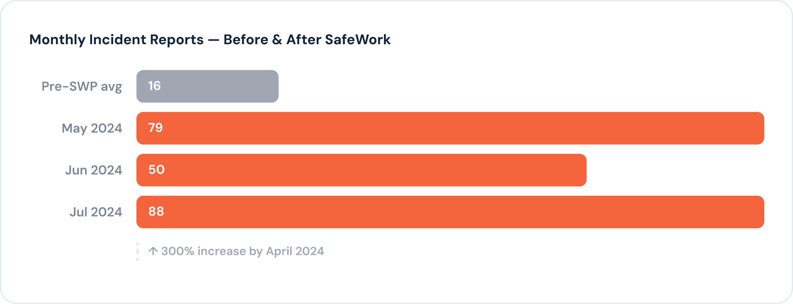 Monthly incident reports — from an average of 16 pre-SafeWork to a peak of 88 within the first year, with sustained high reporting evidencing a genuine culture of openness and continuous improvement.