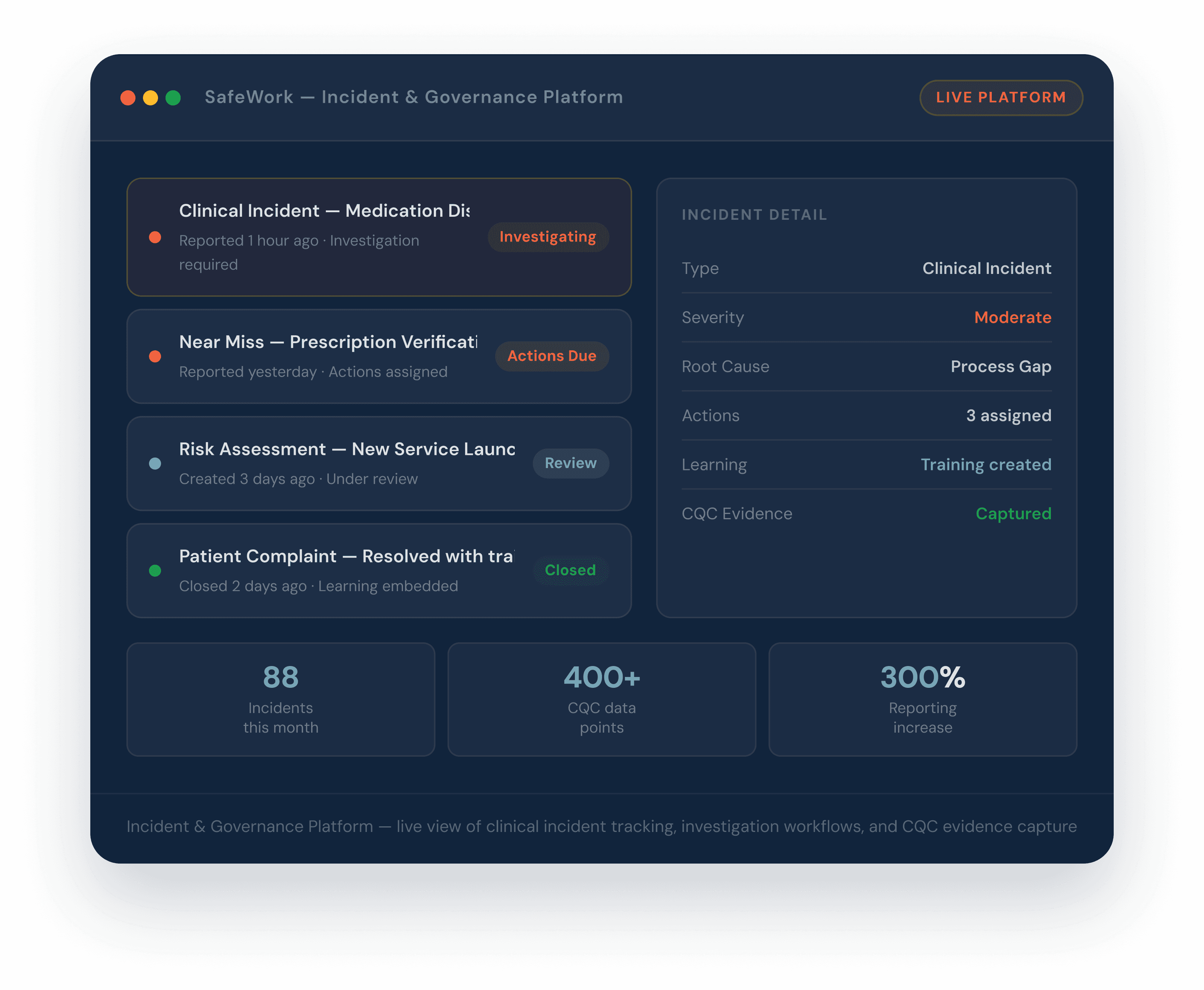 SafeWork's analytics and data layer produced over 400 discrete data points for Voy Men's first CQC audit — covering incident trends, root cause analysis, action completion rates, risk register status, policy compliance, and evidence of learning and improvement. This wasn't data that had to be manually assembled from spreadsheets the night before an inspection. It was live, structured, and audit-ready at all times.