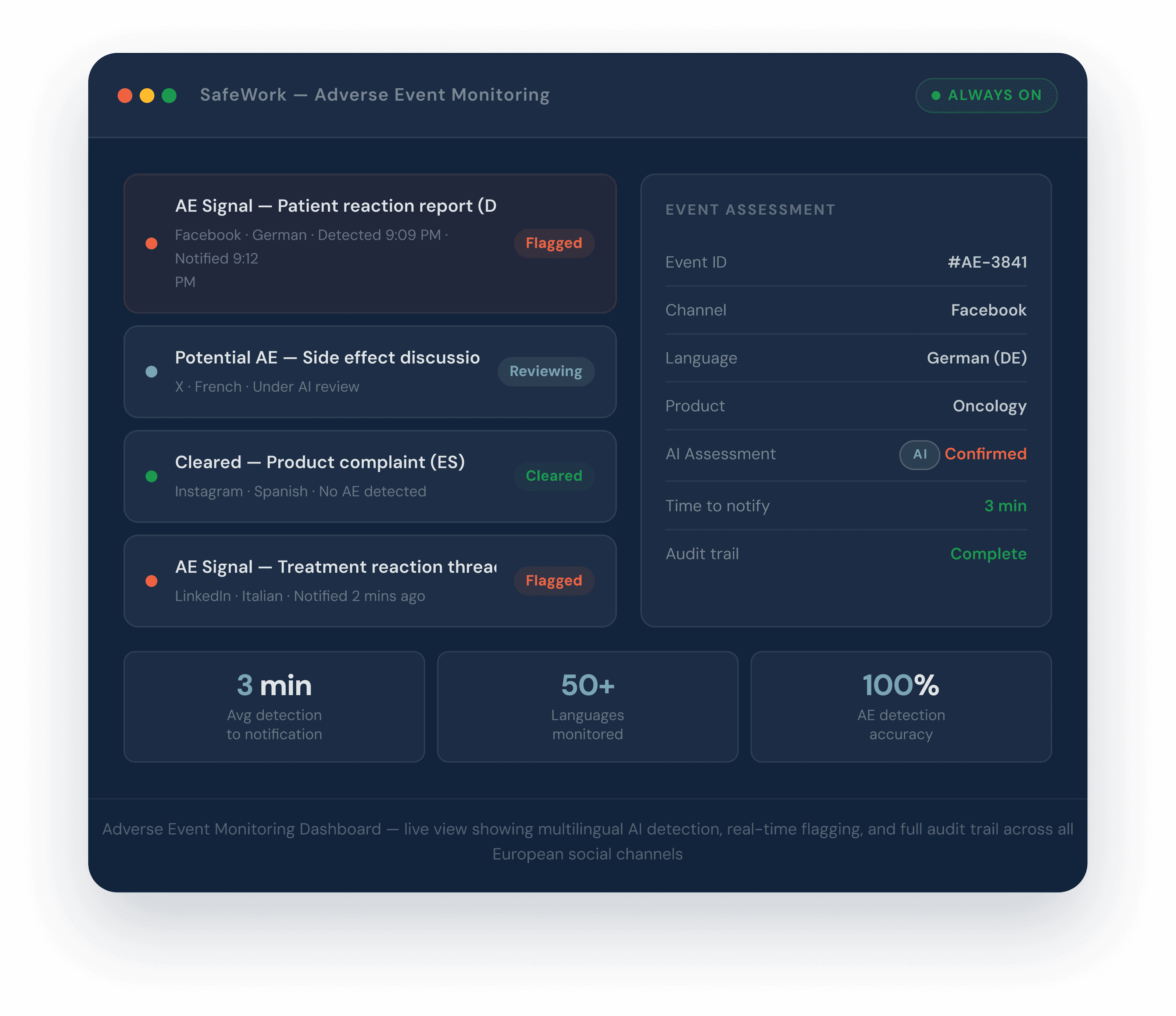 SafeWork deployed its AI-driven adverse event monitoring platform for Roche Europe — replacing the manual process entirely. The system continuously monitors all major social channels on an hourly basis, scanning for adverse event signals in over 50 languages using natural language processing. When a potential adverse event is identified, it is automatically assessed and a full notification is sent to the Roche team within three minutes. Detection at 9:09 PM. Client notified by 9:12 PM. Every time.