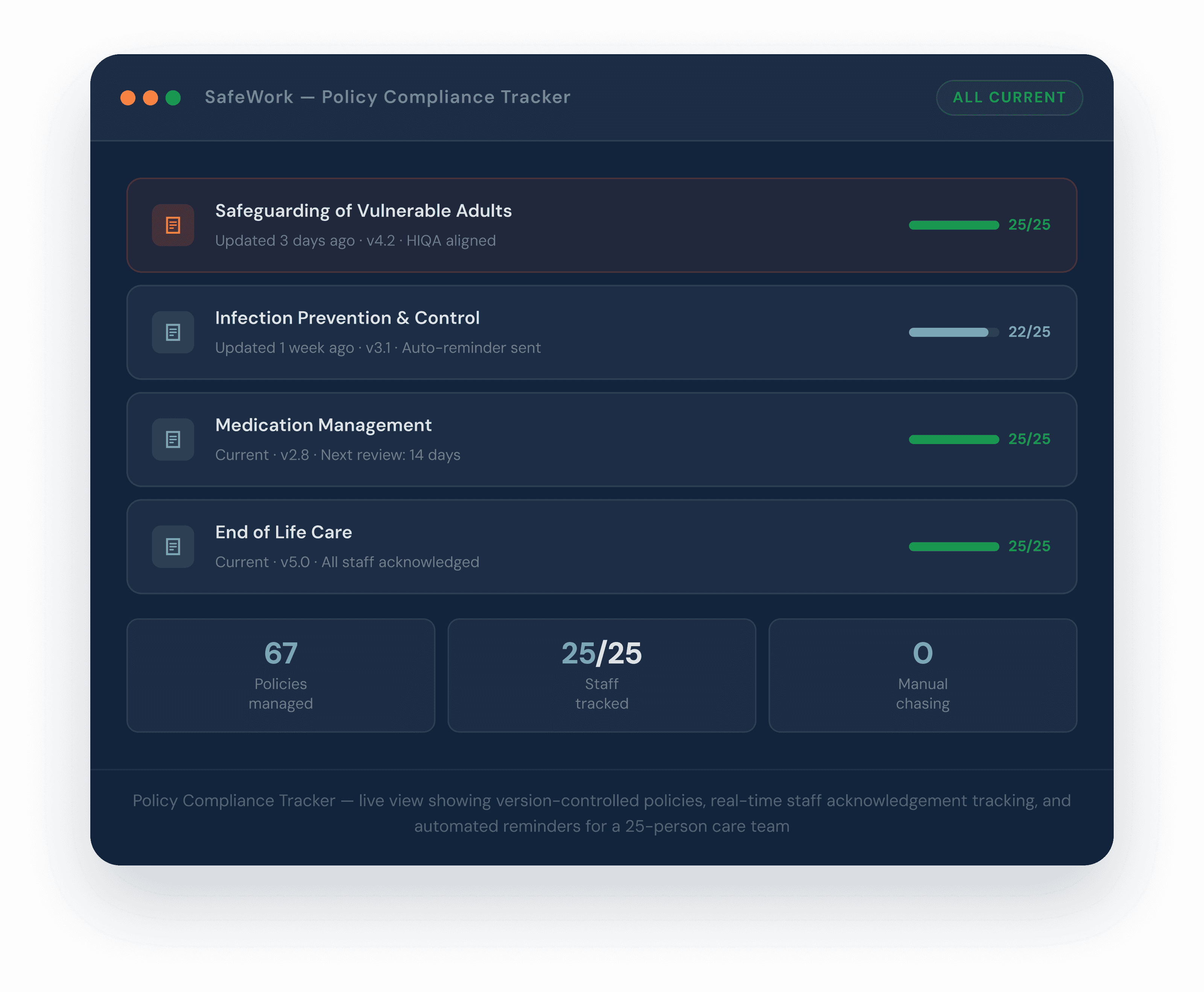 With SafeWork in place, Anna has a live view of compliance status across the entire team —who's acknowledged what, what's overdue, and what needs attention next. The automated reminders and tracking free up the hours she used to spend chasing sign-offs, giving her time back for the work of running the home.