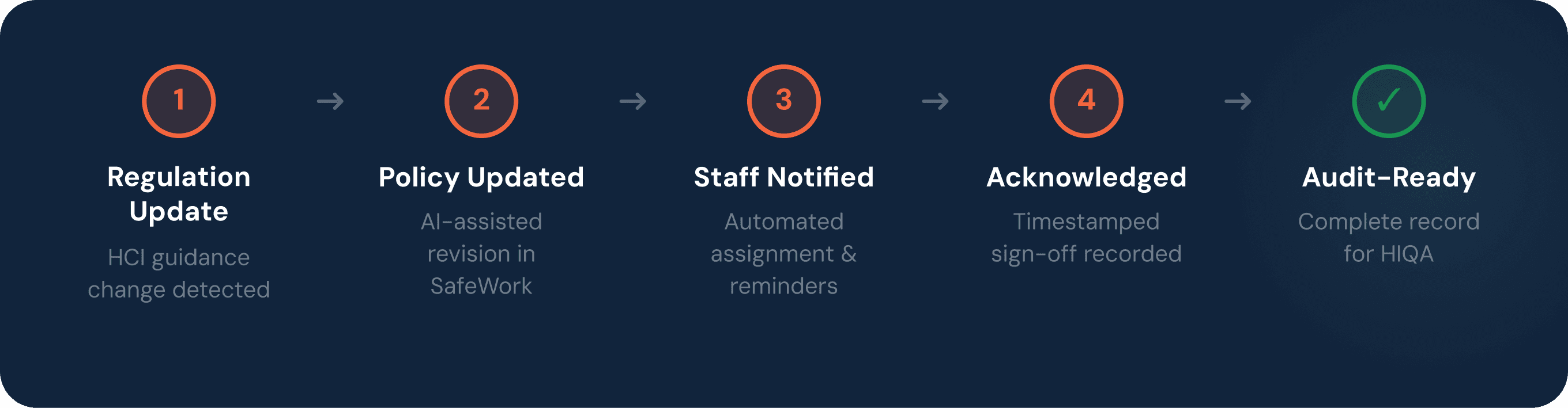 Before SafeWork, compliance at St Columban's ran almost entirely through Anna's attention. When regulators updated guidance, an email alert would arrive from HCI. From there, it was on her to determine what needed updating across the home's 67 policies, make the changes manually, and somehow confirm that every staff member had read the new version. There was no system tracking what had changed, when, or who had acknowledged it.