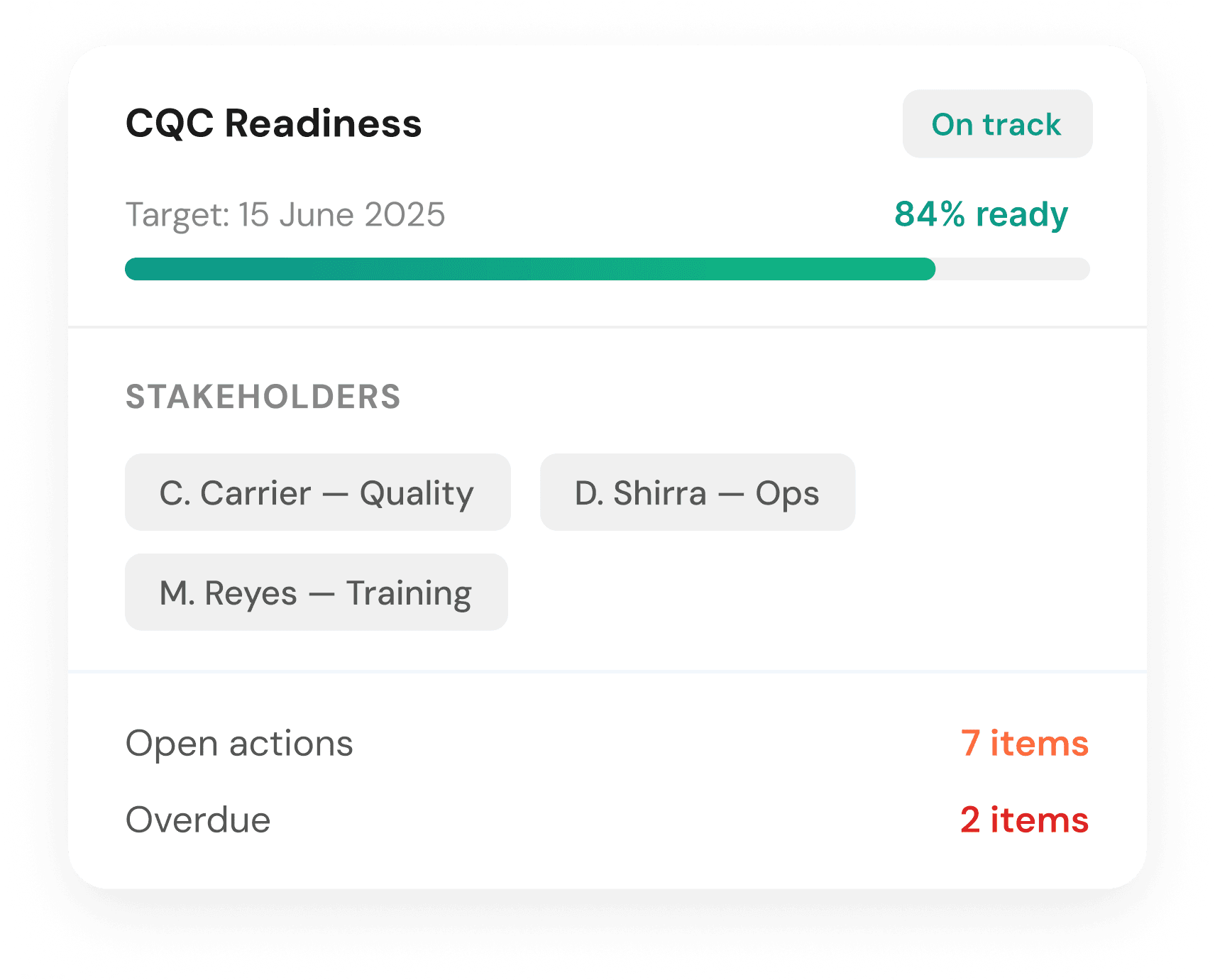 Yes you can assign different stakeholders to different frameworks and set individual readiness targets for each. Every team member sees exactly what they're responsible for and what needs to be done by when. The platform tracks progress against each target date and escalates items that are falling behind, so nothing slips through the gaps between teams.
