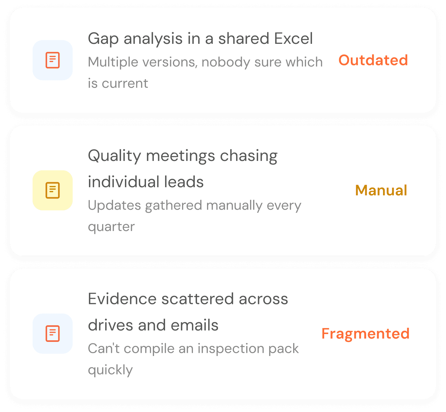 Whether you're tracking one framework or ten, Safe Workplace gives every stakeholder a clear view of what's covered, what's missing, and what they need to do, without a single quality meeting spent chasing updates on a shared spreadsheet.