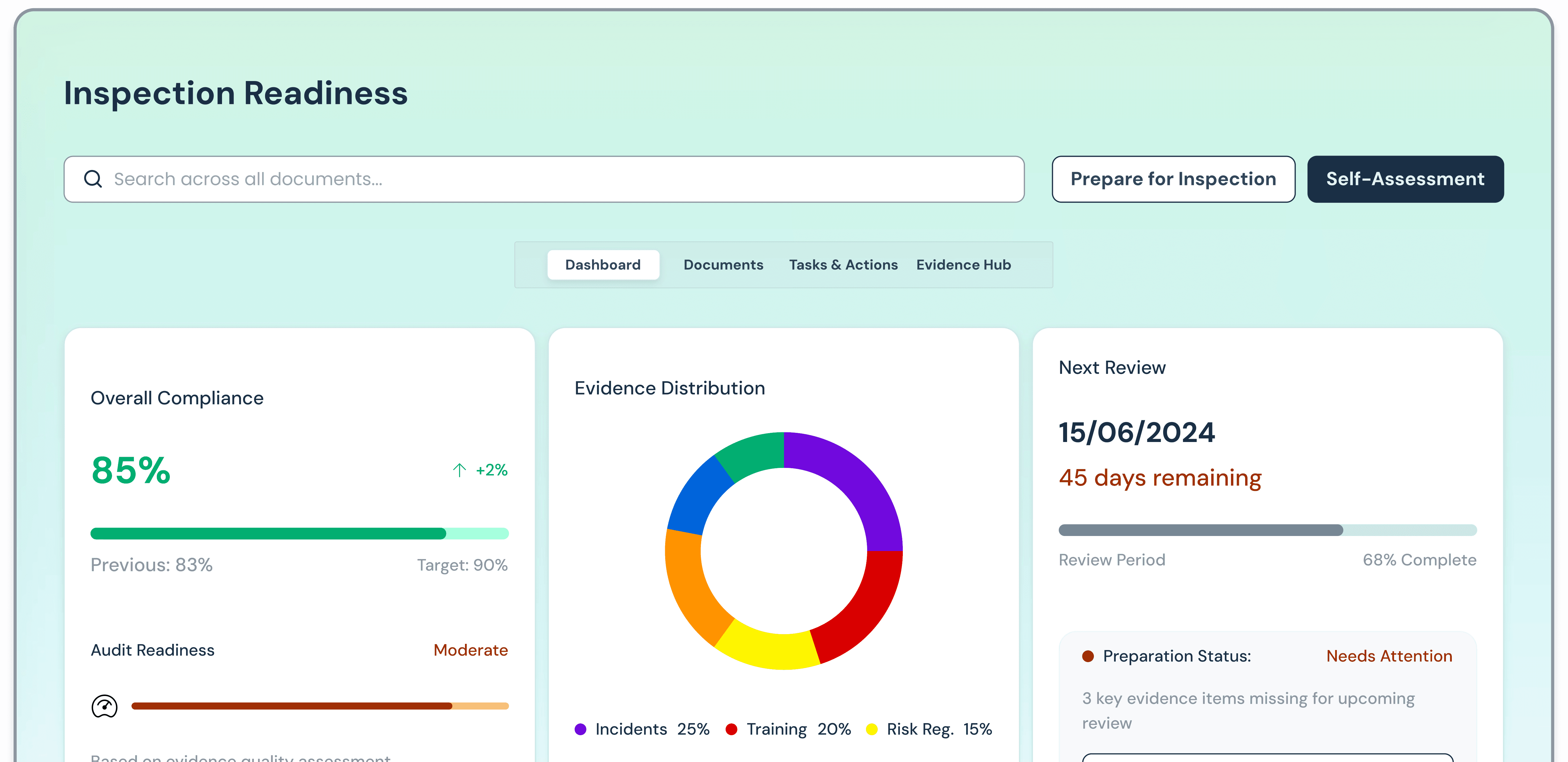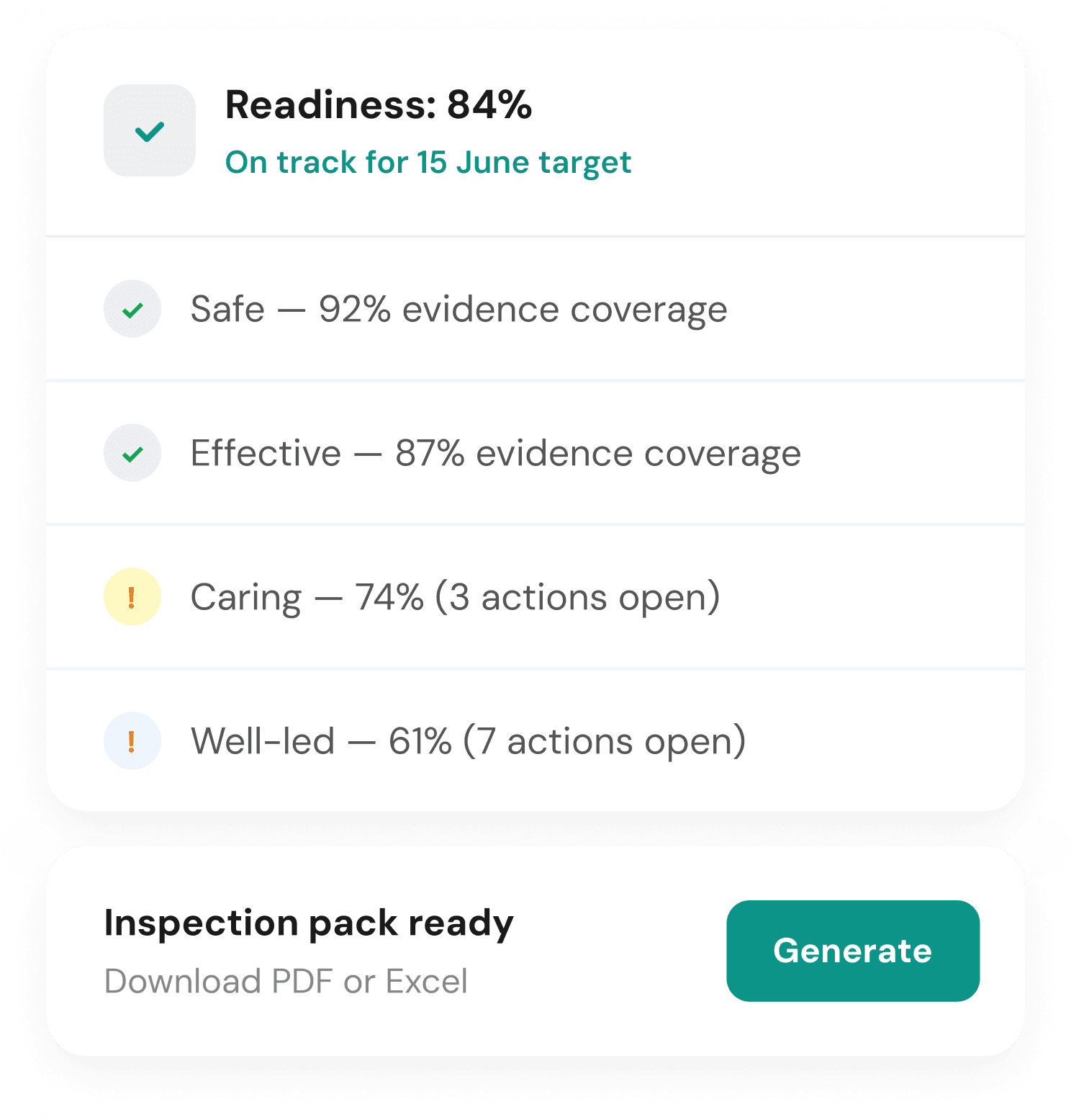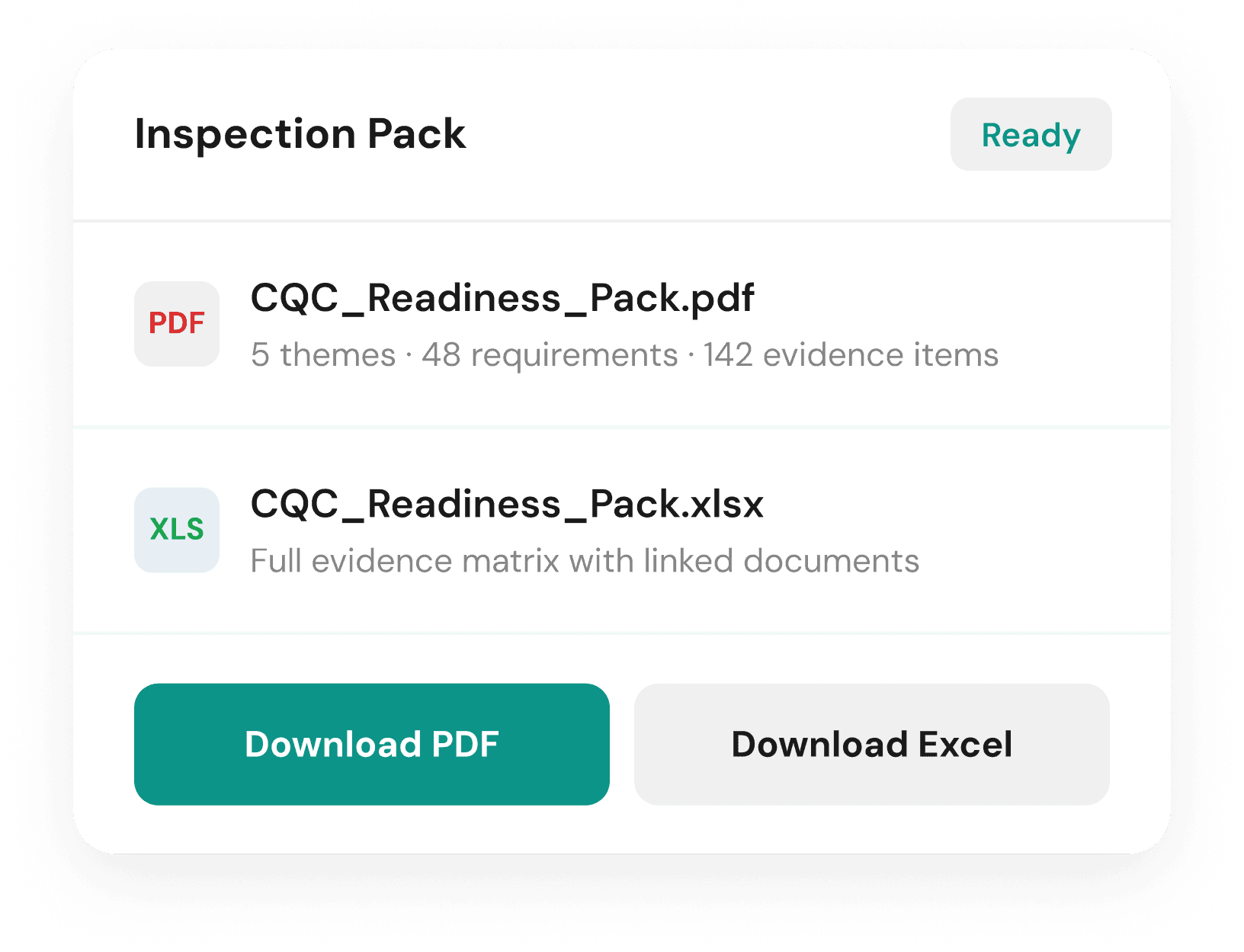 Everything an assessor would need, in one download. The inspection pack includes all evidence items, compliance actions, justifications for untracked requirements, and a structured breakdown by theme, available as PDF or Excel. It's generated in a single click, whether you're preparing ahead of a scheduled inspection or responding to one that's arrived unannounced.