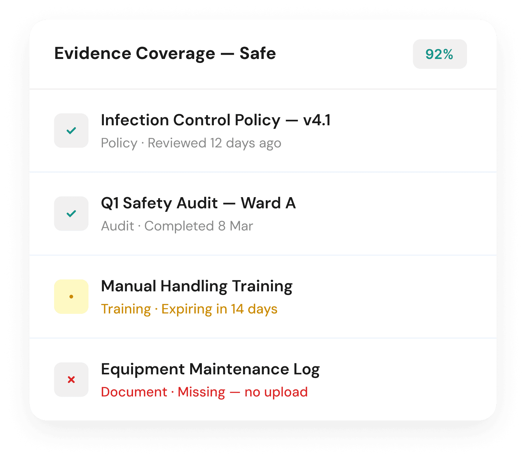 Your coverage score updates automatically as activity happens across the platform. Every completed policy review, finished audit, training record, and uploaded document contributes to your evidence coverage in real time. If something is expiring, missing, or falling behind, the platform flags it, so your score always reflects your actual position, not where you were last quarter.