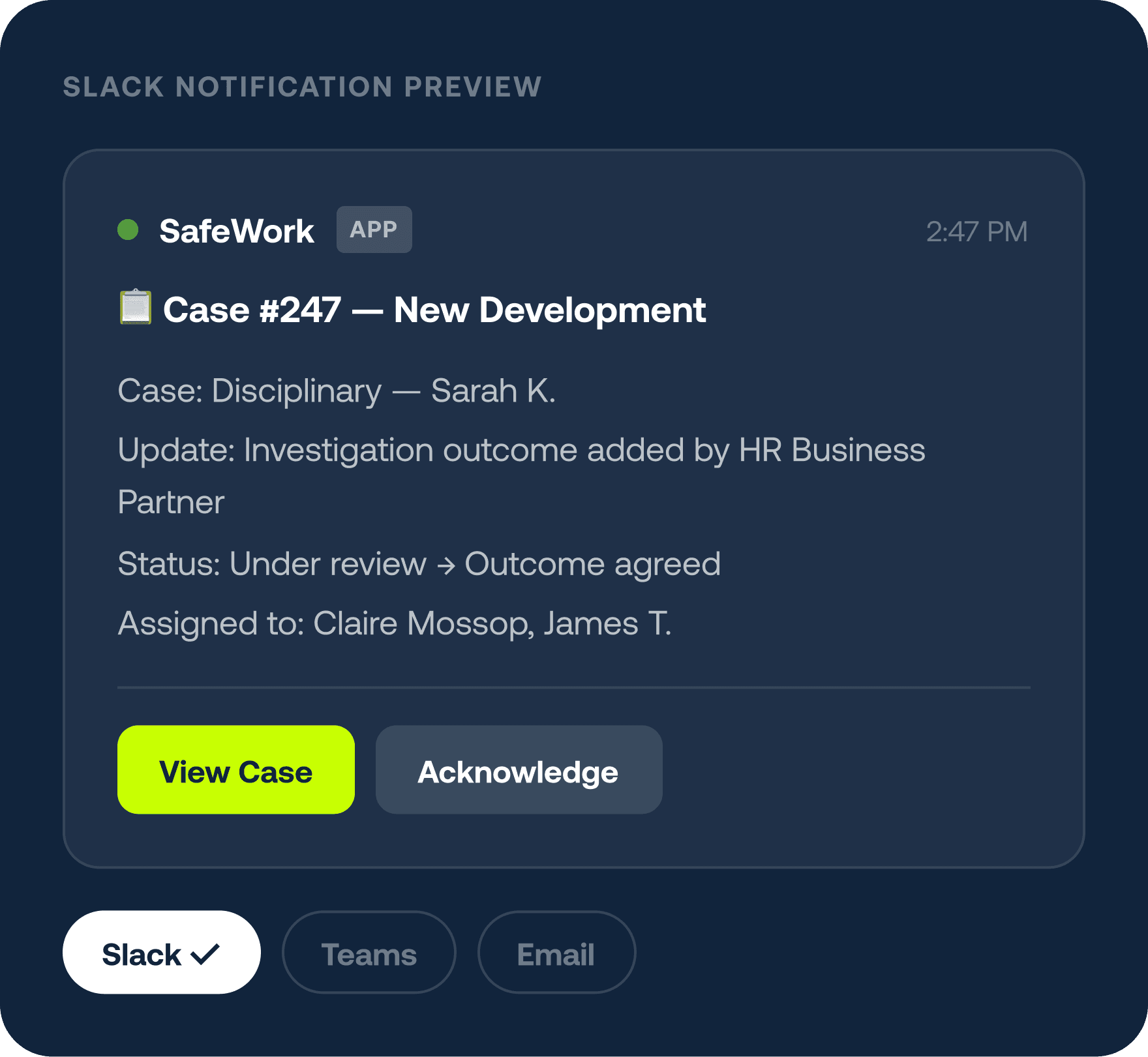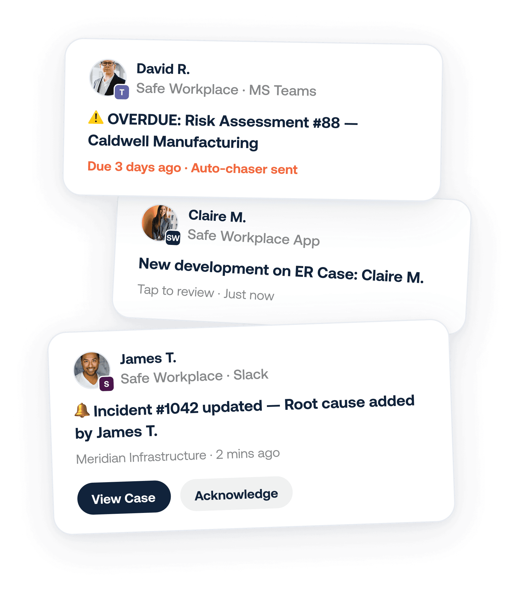 Reach your team in Slack, Microsoft Teams, WhatsApp, email, SMS, browser desktop notifications, or the SafeWork mobile app. One workflow, every channel.