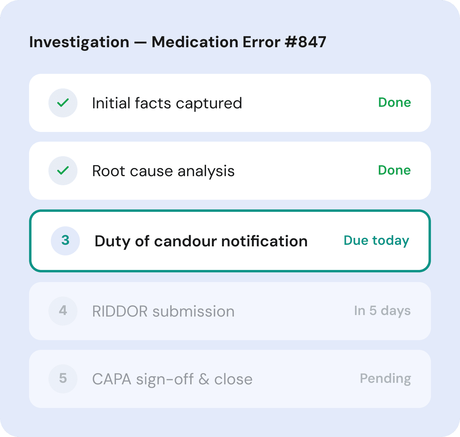 Structured investigations that satisfy CQC, PSIRF, and duty of candour.