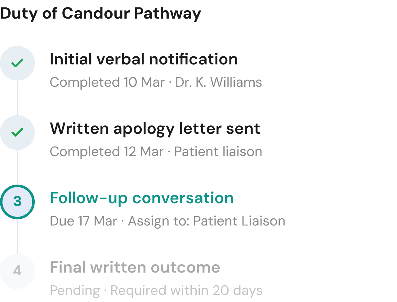 Safe Workplace guides you through the entire duty of candour pathway, initial verbal notification, written apology, follow-up conversation, and final written outcome, with built-in letter templates, deadlines, and a full communication log. Every step is documented and timestamped automatically, and a CQC-ready aftercare record is generated without any manual compiling.