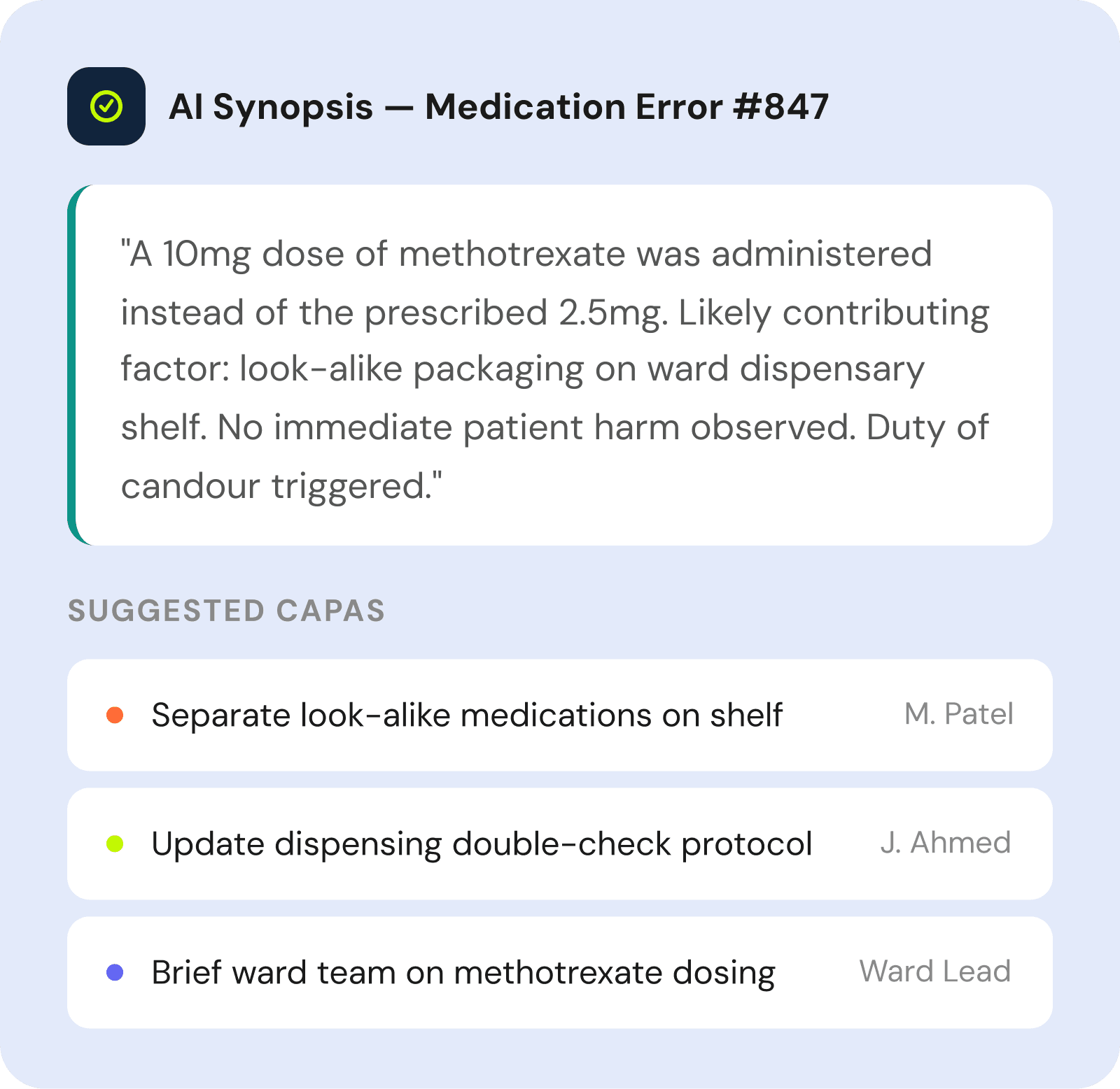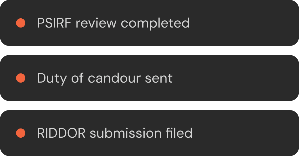 Yes every incident opens a PSIRF-aligned patient safety incident review workflow, built around the frameworks CQC actually inspects. Root cause analysis, required notifications, and regulatory milestones are all tracked in one place, with a full evidence chain at every step so your team is always audit-ready.