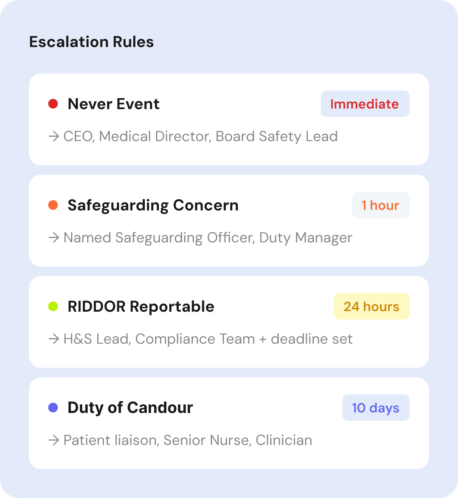 Never Events, safeguarding, and RIDDOR trigger automatically.
